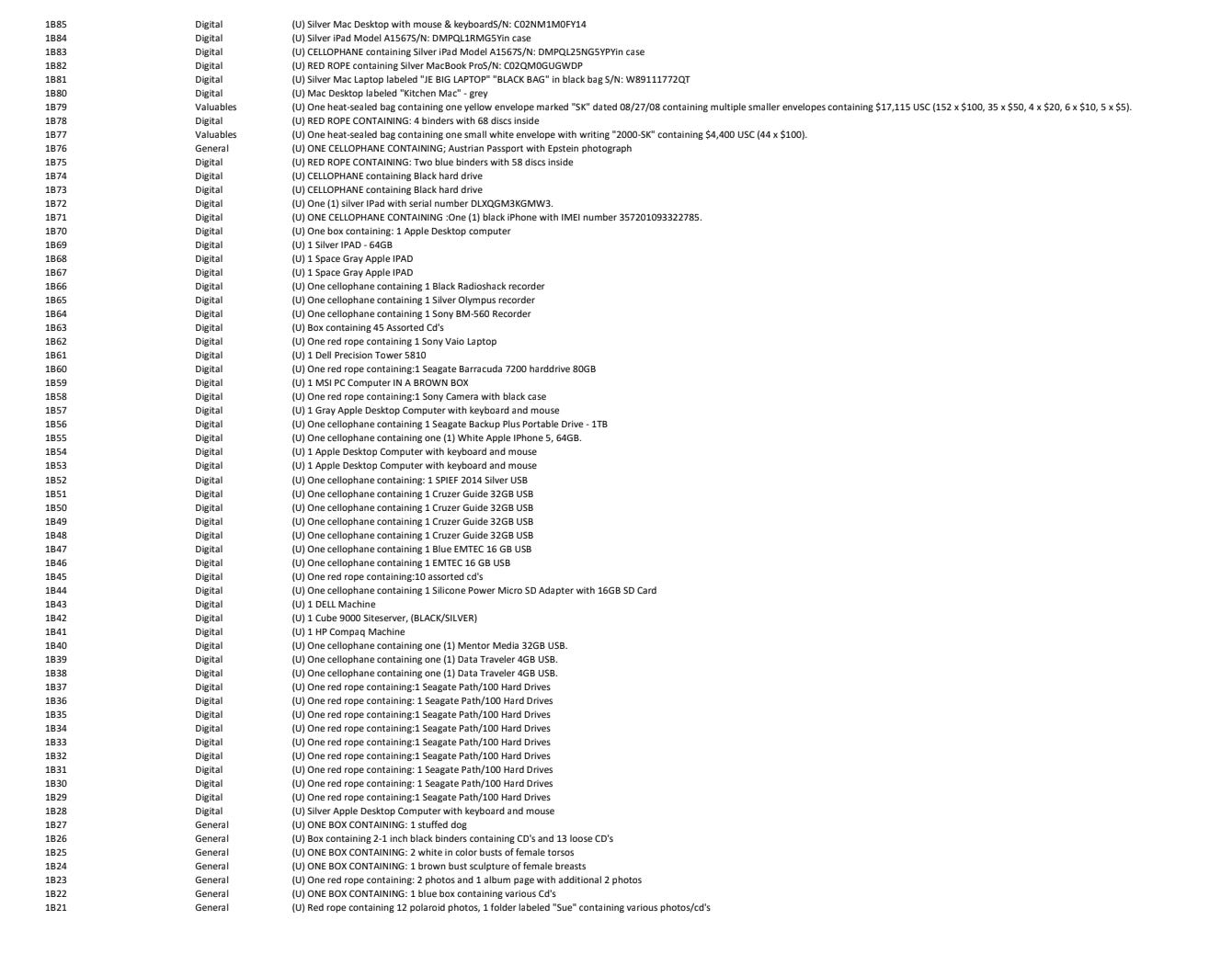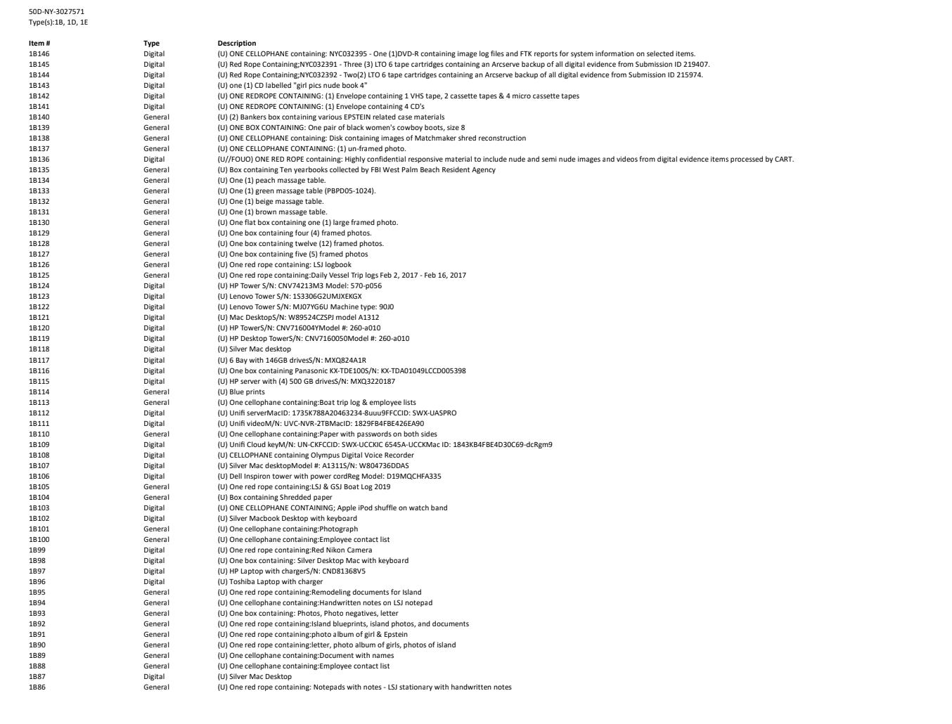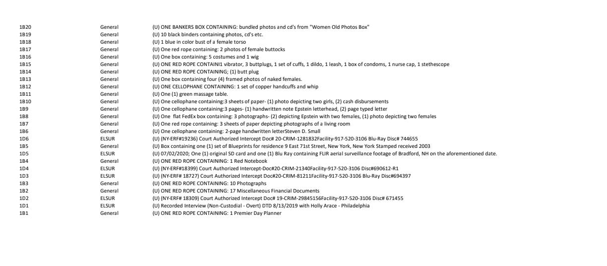 This is an unredacted list of evidence collected related to the Epstein/Maxwell cases. This is not a complete list. The source is still public (for now) and you can see it at https://www.justice.gov/ag/media/1391271/dl? - I’m posting here in case it gets disappeared or somehow… allegedly… self deletes. This is “the list”.